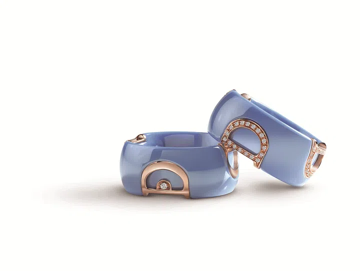 这是Damiani在今年推出的新品,以品牌头文字为符号设计的手镯,利用陶瓷打造出微妙的浅蓝色,或者说是carta da zucchero色。在意大利语中carta是“蓝色纸”的意思,是意大利民间传统用来包糖(zucchero)的纸,这种颜色象征着快乐,品牌结合钻石与金,打造出的手镯,祝福爱情永远幸福。