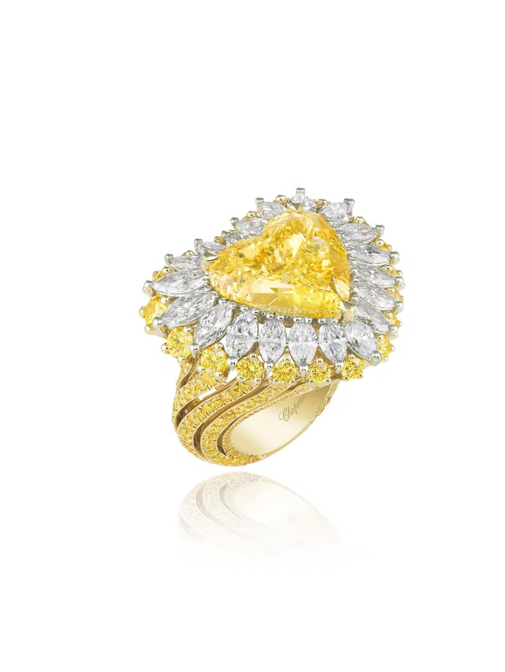 除了著名的Happy Hearts,萧邦也在自己的高级珠宝系列中推出心形的戒指:一颗瑰丽的10克拉心形切割黄钻,周围点缀着榄尖形切割钻石和圆形明亮式切割黄钻。这样的一枚钻戒足以代表你的真心。
