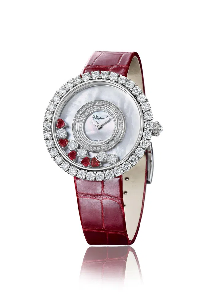 五颗璀璨的钻石与五颗鲜亮的红宝石在表盘上快乐起舞,红色象征着爱情,钻石象征永恒,这枚Happy Diamonds珠宝腕表包含着慢慢的爱意,值得永久珍藏。