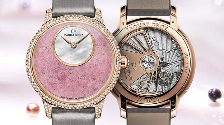 时分小针盘(Petite Heure Minute)是雅克德罗(Jaquet Droz)经典的腕表系列之一,拥有着令人惊叹的细致而特别的外观,自推出以来,不断被工匠大师重新演绎,展现不朽魅力。而这枚蔷薇辉石时分小针盘(Petite Heure Minute Astorite)选用来自美国的珍罕宝石——蔷薇辉石,粉红色底盘上闪耀着幽微细腻的金色和银色辉纹,而黑色斑点和清晰分明的纹理宛如一幅当代艺术画作。品牌将优雅气韵与柔美风情凝聚于腕表之中,显得弥足珍贵,也是非常好的情人节之选。