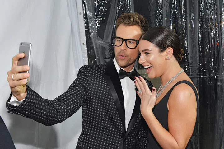 造型师Brad Goreski与好莱坞影星Lea Michele在会场玩自拍;amfAR的洛杉矶灵感盛典上展示的Harry Winston高级珠宝。