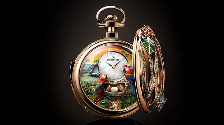 这只怀表为品牌所有工匠大师各尽其才,历时三年秘密研发。雅克德罗在这只怀表上打造自然主义景观,金刚鹦鹉成为主角,一对金刚鹦鹉正照看着三只雏鸟。五只鹦鹉均可活动:左侧鹦鹉全身可动,右侧鹦鹉可摆动头部。一只天堂鸟悠闲徜徉;一只老虎则在一条活动瀑布的脚下饮水。珍珠母贝表盘底部的6点钟位置可见另一只老虎,表盘上游走着两枚金质指针。这款怀表搭载高级钟表界独树一帜的机械机芯——配备教堂钟声音簧的三问报时自动玩偶机芯。此机芯包含668个零件。位于9点钟位置的拉栓可同时启动自动玩偶和报响时、刻、分的报时功能。