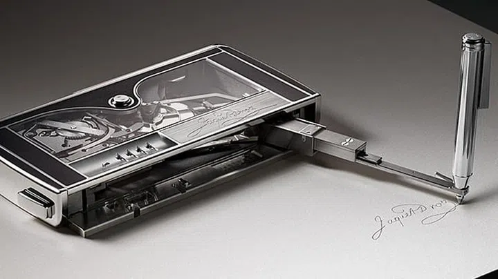 2014年,雅克德罗首次推出签名机器,历时四年研发,新作终于在280周年之际得以露出真容。这一作品以“作家”和“画家”自动玩偶为灵感,其机芯经过重新设计,确保签名更加稳定流畅。这一复杂精巧的机械装置由585枚部件组成,全部采用手工组装。签名的设置装置,换而言之,即将机械动作转换为笔迹的三个凸轮全部采用手工制作。这一令人叹为观止的机械作品让它已然成为艺术杰作。