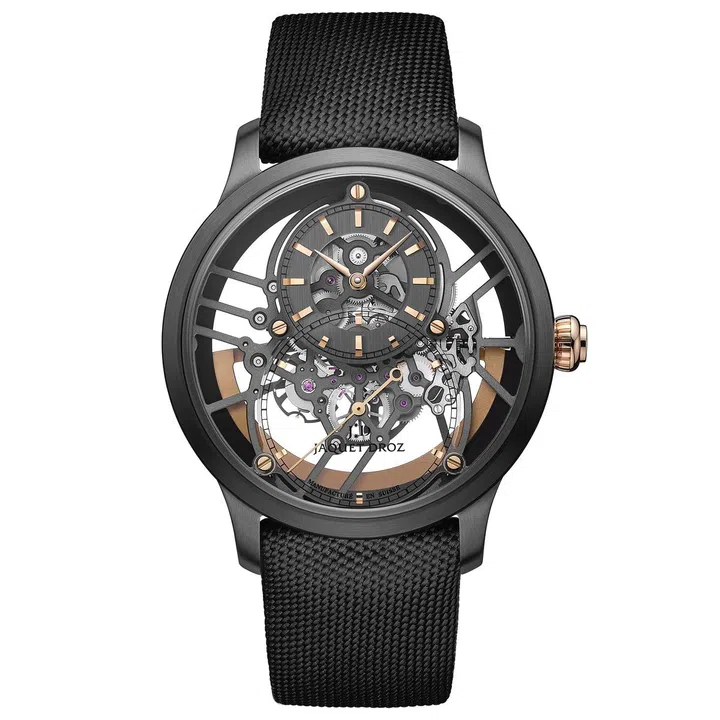 除了品牌首次在大秒针系列中首次推出黄金腕表,雅克德罗也在该系列中带来了首款镂空腕表。大秒针镂空——One腕表保留了时、分、秒显示设计与表盘上的留白空间。雅克德罗巧妙隐匿机芯表桥,时针、分针、秒针,大面积的留白展现通透之美。