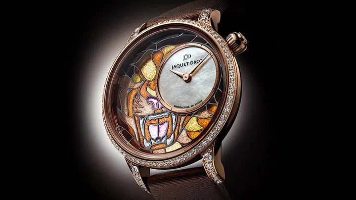 首次运用空窗珐琅工艺,其拉丁文名称为“smalta clara”。雅克德罗(Jaquet Droz)素来以精湛的大明火珐琅工艺著称,而空窗珐琅的工艺难度更高。这种诞生于1500年前的工艺需要精准掌握火候,以避免珐琅龟裂。每次进炉烧制,釉面龟裂的风险随之增大。其成品不再是单一珐琅,而是由不同颜色和形状的珐琅块组成。珐琅块之间以金丝分隔。最终,珐琅并非覆盖于金属底层之上,而是填满镂空格栅,宛如彩绘玻璃窗一般。