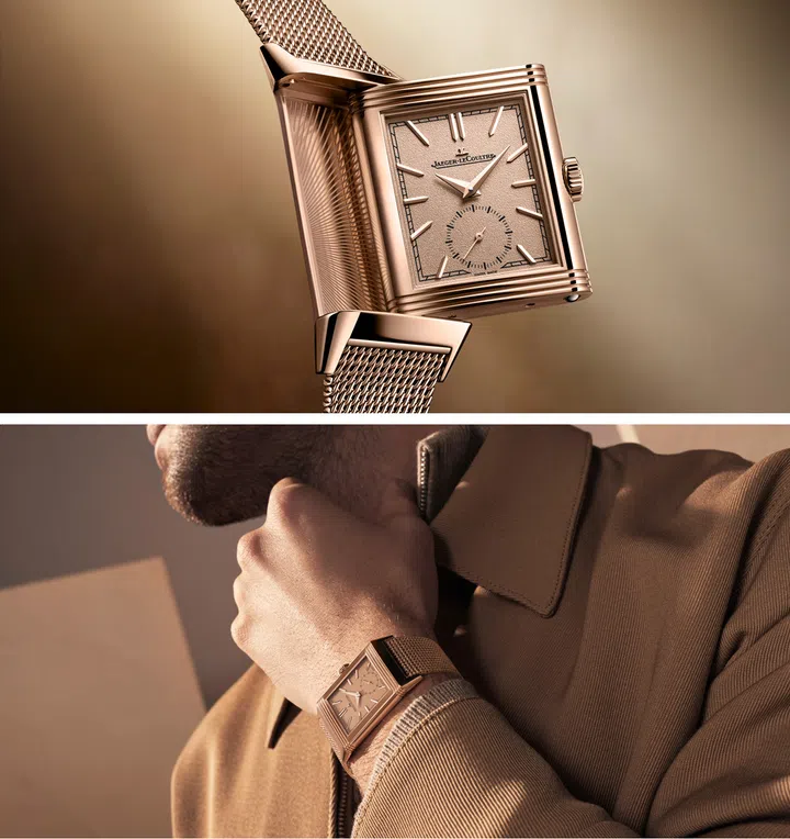 18K玫瑰金表壳与米兰尼斯表带搭配相得益彰,金色粒纹表盘呈现细腻的纹理质感,复刻1930年代的典雅格调。标志性的可翻转表壳,由50个部件精密组成,厚度仅为7.56毫米。米兰尼斯表带的制作工艺尤为独特,由两条至少16米长的玫瑰金丝交织而成,形成结构细密平整的表面,宛如丝缎般柔韧贴肤地缠绕于腕间。米兰尼斯表带的历史可追溯至13世纪意大利,经现代工艺的改良,既具备出色的耐用性,又展现绝佳的韧性和舒适感。表背留白设计是此表款的另一独特之处,佩戴者可根据个人喜好,镌刻专属印记,赋予腕表独一无二的个性和纪念价值。