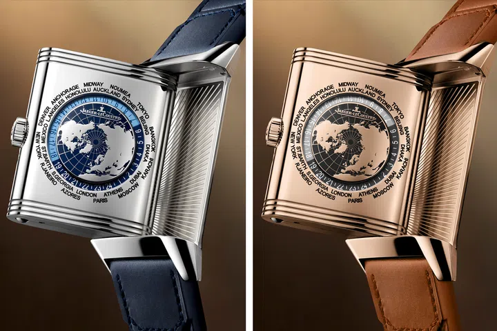Reverso Tribute Geographic翻转系列地理学家腕表:左为精钢款搭配蓝色表盘,右为限量发行150枚的玫瑰金款,搭配巧克力棕表盘。
