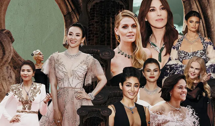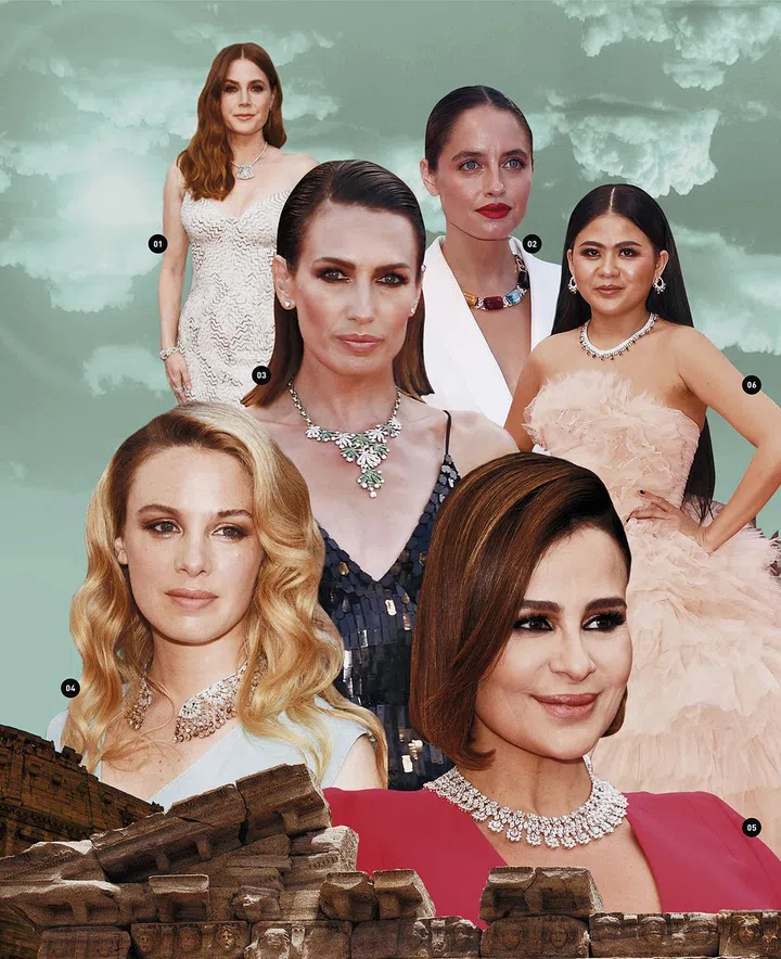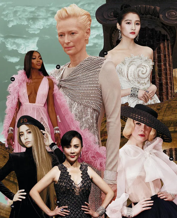 1.关晓彤佩戴萧邦Haute Joaillerie系列手镯、耳环及Magical Setting系列戒指。2.Tilda Swinton佩戴卡地亚Agraffe de Cartier系列手镯。3.Naomi Campbell佩戴宝格丽Heritage典藏系列铂金手镯、铂金红宝石手镯及戒指。4.蔡依林佩戴Serpenti 系列手镯及戒指。5. 刘嘉玲佩戴卡地亚高级珠宝系列美洲豹蓝宝石流苏耳环与戒指、高级珠宝系列钻石花环手镯及1895系列钻石戒指。6.Elle Fanning佩戴萧邦Red Carpet系列白金镶钻手镯及Red Carpet系列白金镶嵌蓝宝石与钻石腕表。
