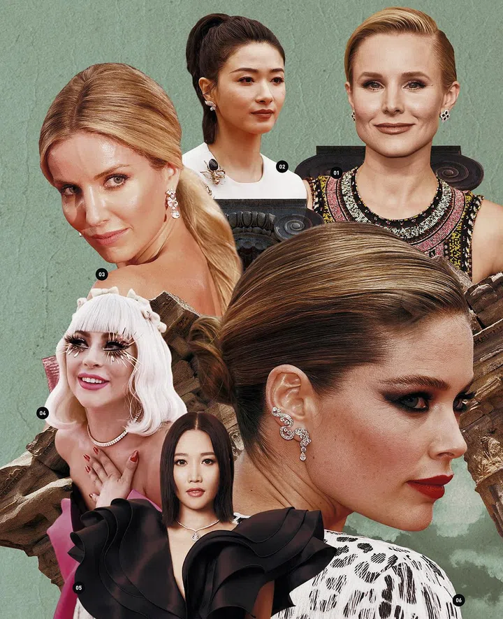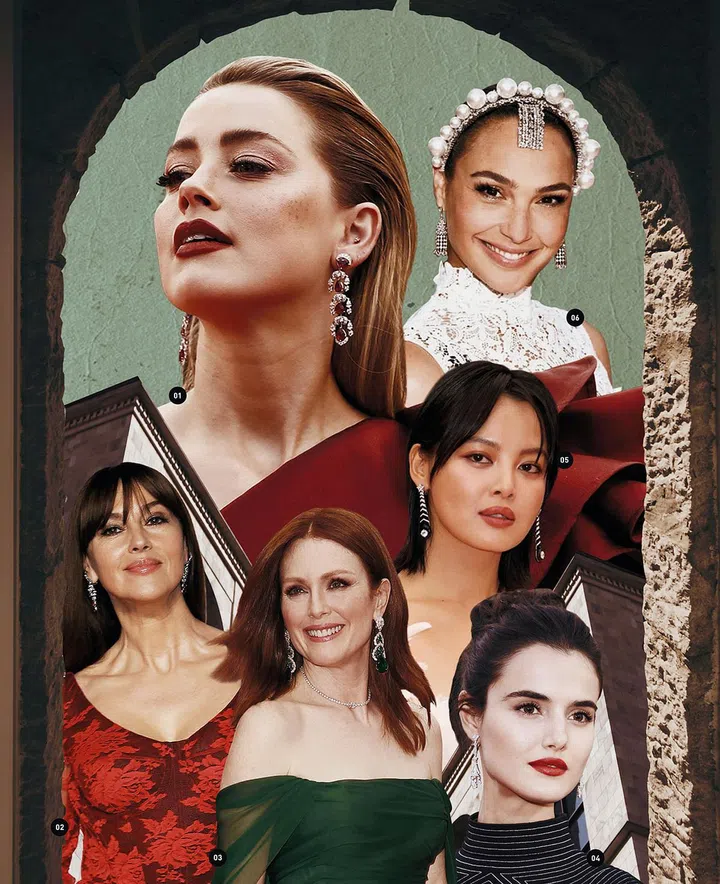 1.Amber Heard佩戴萧邦Red Carpet系列白金镶嵌红宝石与钻石耳环。2.Monica Bellucci佩戴卡地亚高级珠宝耳环,铂金镶嵌祖母绿形切割红宝石与钻石。3.Julianne Moore佩戴萧邦Haute Joaillerie系列项链、Red Carpet系列耳环。4.Blanca Padilla佩戴宝格丽高级珠宝耳环。5.辛芷蕾佩戴香奈儿 (Chanel) Comet 18K白金镶嵌钻石与缟玛瑙耳环。6.Gal Gadot佩戴蒂芙尼钻石耳环。