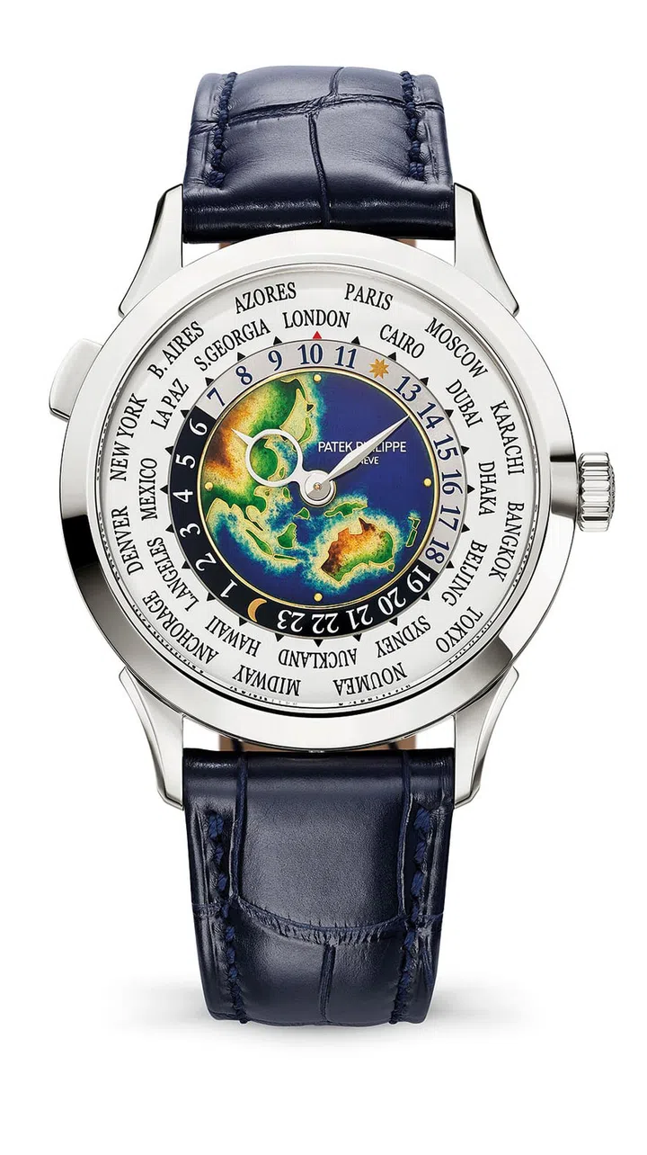 另一款亮眼新作是Ref. 5231G-001珍稀工艺世界时间腕表。自路易•柯蒂耶(Louis Cottier)于1930年代发明世界时间装置以来,百达翡丽经典的世界时间腕表,常以大明火掐丝珐琅世界地图装饰表盘,这款新表延续传统,以大明火掐丝珐琅图案装点表盘,勾勒大洋洲和东南亚的壮丽版图,让人再次窥见“表王”精湛的表盘布局工艺。表款也搭载了Caliber 240 HU自动上弦机芯,具备24小时制显示与昼夜显示功能,从内部精密的机械组件到考究的工艺美学,展现百达翡丽融合传统与革新的理念。