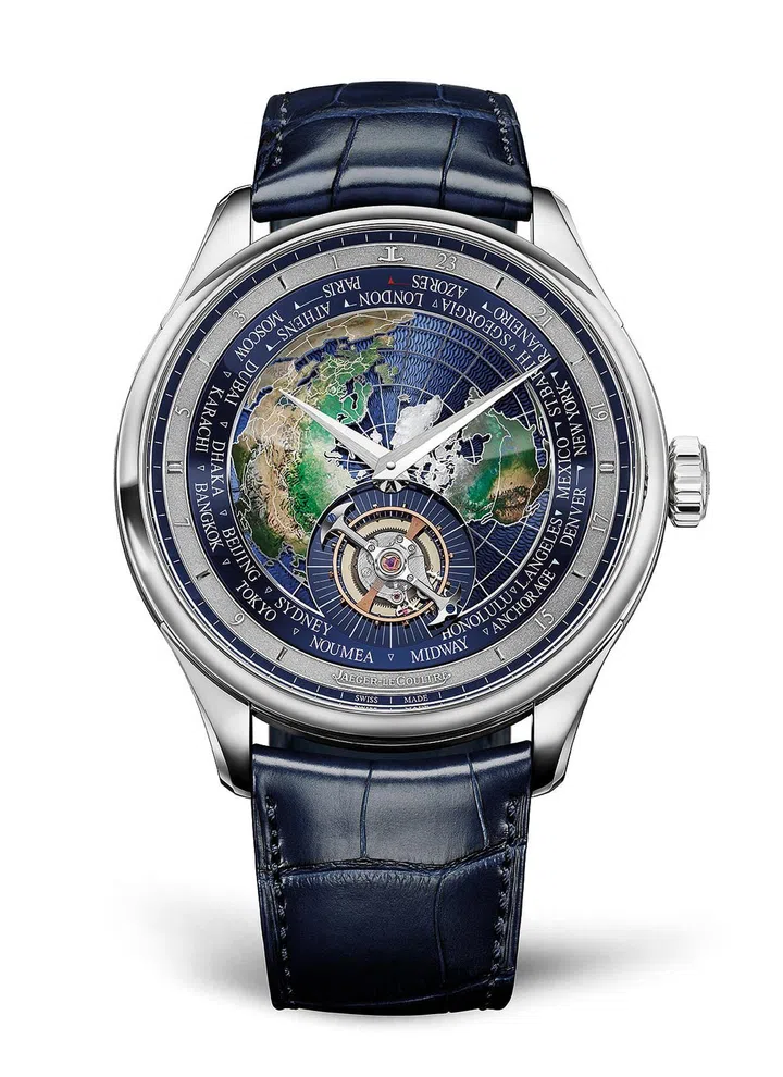 积家自制的机芯享誉全球,这枚独特的世界时陀飞轮就搭载了品牌自产的948型机芯,首次将世界时复杂功能与飞行陀飞轮融为一体,分别每60秒自转一圈,并每24小时在表盘上公转一周,而24小时恰好等于一个平均太阳日。与所有经典世界时显示一样,每个时区都分别以各自的城市名称表示,围绕中央表盘排列成一圈。
