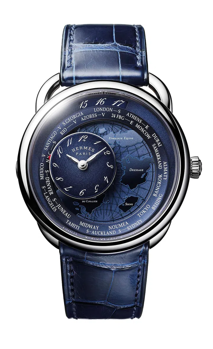 表盘上的世界地图,源自于Jérôme Colliard为爱马仕设计的Planisphere dun monde équestre丝巾图案,描绘了一个想象中的奇幻国度。制作过程中,先以转印的方式将地图上的陆地轮廓和名称,印在电镀的金属表盘上,再使用激光雕刻、烤漆将之完成。腕表除了蓝色38mm的精钢款式外,亦有浅灰色直径41mm的铂金版本,可随心搭配由爱马仕皮表带工坊打造的短吻鳄鱼皮或Swift小牛皮表带,呈现不同“表”情。