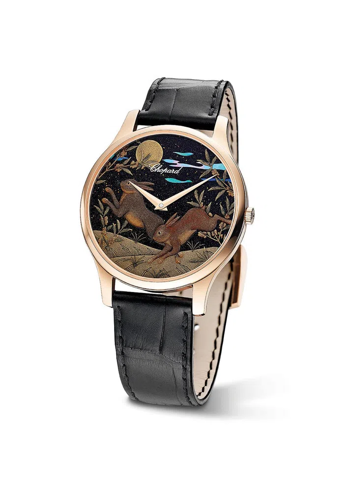 萧邦(Chopard)每年皆以不同方式诠释十二生肖的深刻涵义,由此带来丰富多变的表盘设计。此次推出88枚L.U.C XP Urushi Year of the Rabbit兔年莳绘腕表,将金艺与漆艺巧妙结合。39.5毫米直径表壳以符合萧邦可持续发展和社会责任理念的玫瑰色18K金打造,灵感汲取自中国神话中的玉兔。表盘出自具有百年历史的山田平安堂工坊(Yamada Heiando),并由漆艺大师小泉三教(Minori Koizumi)绘制,耗费不少于160小时的精工细作。萧邦委托日本漆艺大师在表盘上描绘出皓月当空,桂枝掩映下一灰一褐的“双兔图”。桂花是产自亚洲的特有灌木植物,气味芬芳,而中国文化中更以“蟾宫折桂”来比喻步步高升,事业有成,表盘画面