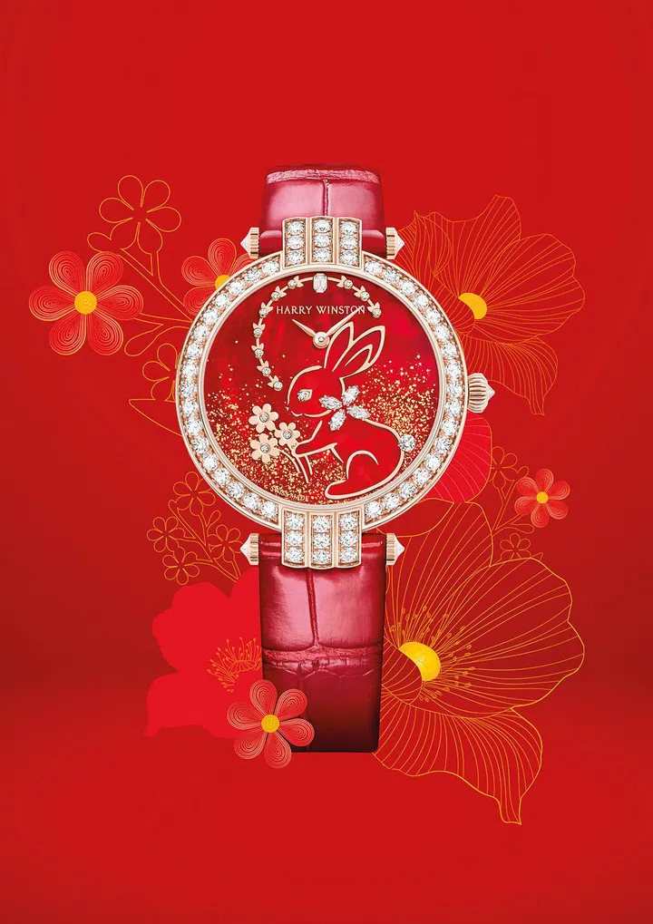 海瑞温斯顿(Harry Winston)今年特别以玉兔的传说作为农历新年主题腕表表盘的设计灵感来源。珍珠母贝表盘上的设计呈现玉兔采集野花,准备研制长生灵药的画面。红色与金色的融合运用,代表幸运美满和富贵吉祥,钻石的点缀则为玉兔增添璀璨光芒。象征月球的环形轮廓由精致小巧的兔子头部形状勾勒而成,上面点缀着圆形明亮式切工钻石和玫瑰金兔耳,以此突显玉兔和月亮的永恒和共生关系。时间指示采用偏心设计,以代表月亮的金钻环形为指针盘,颇具巧妙构思。亮面红色鳄鱼皮表带,与表盘相呼应。限量发行8枚的这款腕表采用色彩鲜明且富有光泽的红色礼盒包装,礼盒上饰有玉兔采花的金色剪影以及独特的兔子头部造型。