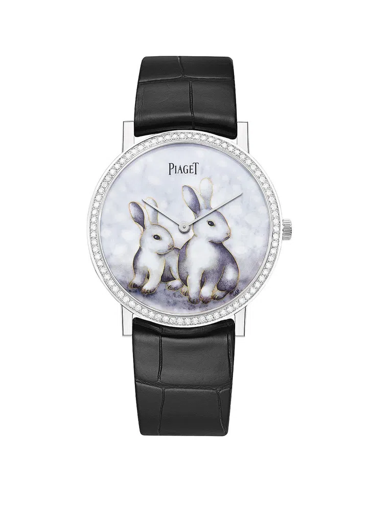 伯爵(Piaget)今年依旧以Altiplano至臻超薄系列为基础,打造限量38枚的兔年限定版掐丝珐琅腕表。38毫米白金腕表的表盘饰以大明火掐丝珐琅工艺烧制而成两只玉兔,表圈镶钻,搭载430P超薄手动机芯,搭配黑色皮表带。