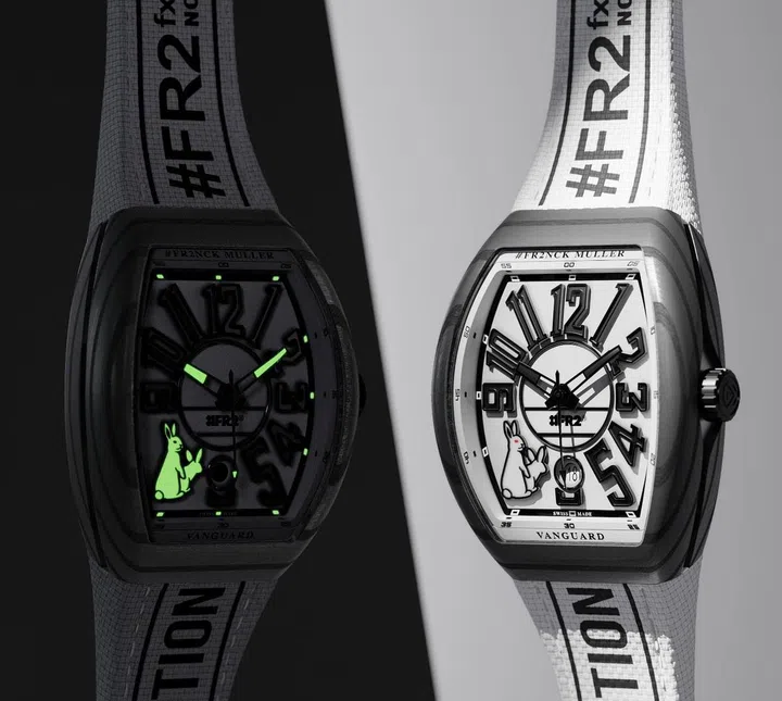 法穆兰(Franck Muller)为迎接兔年到来,首次与东京街头服饰品牌#FR2合作。全新#FR2NCK MULLER Vanguard以#FR2 标志性的兔子主题做根基,注入法穆兰著名的酒桶形状大数字表盘当中。哑光白色表盘为基底用黑色表针和数字建立了高调美感。 黑白色调为基础,表盘7点钟方向取代数字的是#FR2 Fxxking Rabbit 兔子图案,俏皮又具挑逗性,当中兔子的红眼睛成了表盘上的唯一颜色点缀,与黑白色调形成了鲜明对比。黑暗中,Super-Luminova 涂层方型表针和兔子图形脱颖而出。表壳使用了崭新的碳纤维石英塑材质呈现。这款材质首次亮相于品牌,并且只限于东南亚地区限定款式可见。最后加上黑色字体装饰的白色尼龙表带作为点缀,呈现街头时尚爱好者们通晓的风格。