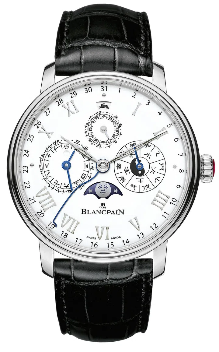 宝珀(Blancpain)遵循品牌于2012年开创的贺岁传统,推出全新经典V系列中华年历限量款腕表。腕表由铂金打造而成,限量发行50枚,表盘上呈现了干支纪年、阴阳合历、十二时辰、生肖五行等中华年历独有的显示功能,摆陀上还镌刻一对栩栩如生的宝兔图案,以致敬即将接棒的守岁生肖。中华年历表是宝珀历时五年半独家研发的里程碑式明星作品,其精密繁复程度,堪比高级制表领域中最具代表性的大复杂功能之一万年历腕表。中华年历表将中国传统农历(一种阴阳合历)与格里高利历法(即公历)完美结合,首次让中西两套时间规则,同“芯”运转。 腕表采用温润的白色大明火珐琅表盘,镶嵌金质收腰罗马数字刻度,由造型优雅的镂空柳叶针指示;以珐琅绘制的标准公历日期,则由经典蓝钢蛇形指针指示。时辰、 星期、月份(包括闰月)、十二生肖、五行及天干等中华年历的重要信息同样采用珐琅绘制的形式呈现。