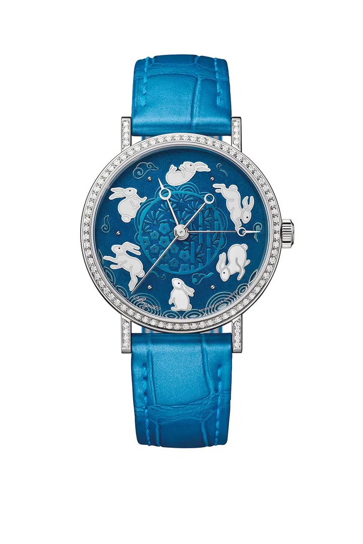 宝玑(Breguet)限量呈献8枚专为女性设计的Classique经典系列9075癸卯年生肖腕表,融合品牌标志性的珐琅工艺与雕刻技艺。腕表采用蓝色“大明火”珐琅表盘,6只姿态各异的玉兔形象诠释时间艺术,尽显女性的睿智与灵动之美。此外,表盘上还可见祥云、梅花、竹子等国风元素,玉兔中间的图案则让人联想到窗花剪纸。33.5毫米的表壳采用18K白金打造而成,表圈和表耳镶嵌88颗钻石,内部搭载宝玑自制的591C型号自动上链机芯。蓝色鳄鱼皮表带饰有同色缝线,呼应表盘设计,浑然一体。