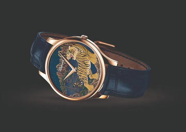 翻转表壳,镌刻于玫瑰金表背之上的生肖虎形象栩栩如生,仿佛将从不透明黑色大明火珐琅背景中跃然而出。采用抛光润饰的老虎皮毛,与经磨砂处理的镀铑虎纹可巧妙捕捉并折射光线,光影流转间,更显灵动威严。为进一步强调镌刻图案的立体感与深邃感,镌刻师运用“浮雕”工艺,以各种不同尺寸的凿刀逐步雕凿金属。与表壳背面一样,腕表表盘同样覆盖不透明黑色大明火珐琅。设计简约优雅,搭配刻面镶贴时标、轨道式分钟刻度,以及与玫瑰金表壳互相呼应的太子妃式指针,凸显亮黑色背景的考究美感。