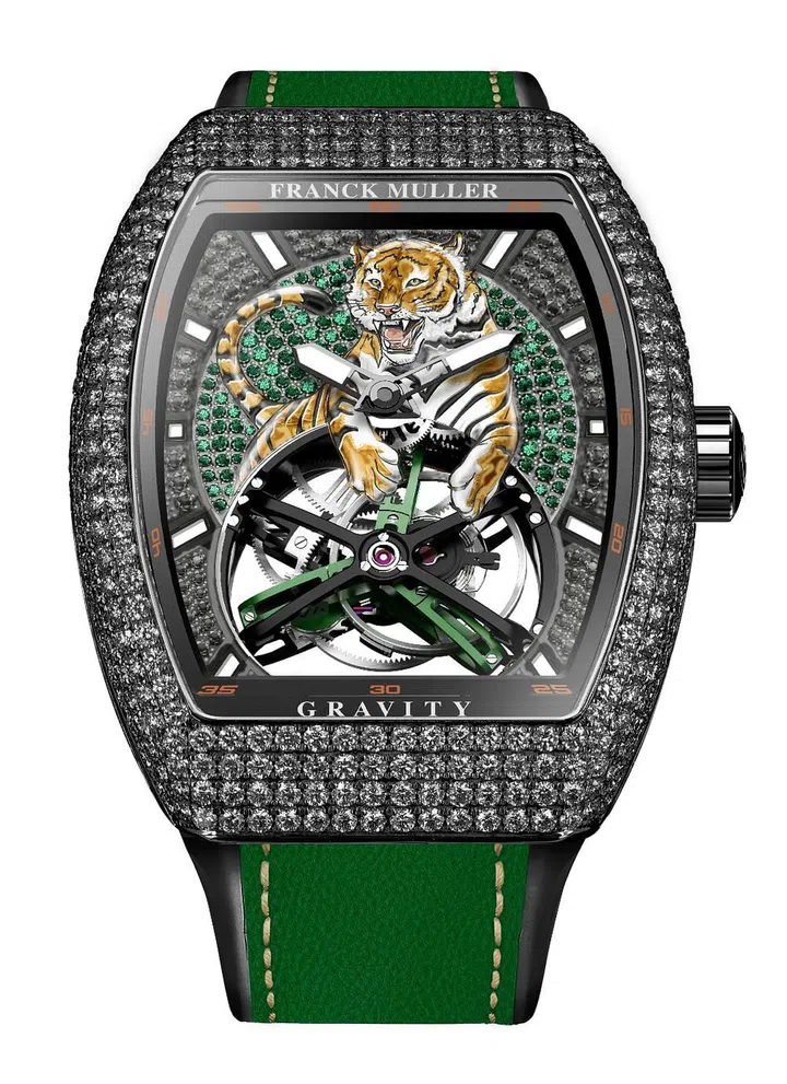 今年适逢法穆兰(Franck Muller)创立30周年,品牌特别推出Vanguard Gravity Tiger的精表,全方位展现自家高超的制表实力,以及镶嵌、微型雕塑和彩绘方面的匠艺。表盘上添置了由位于瑞士Les Bois的法穆兰工坊精心打造的手工老虎雕塑,仿佛在陀飞轮顶端跳跃的老虎,配上密密麻麻的白钻,宛如在星空中大放异彩。表盘上的虎爷,以手工雕塑、绘色,周围以手工镶嵌了顶级白钻。