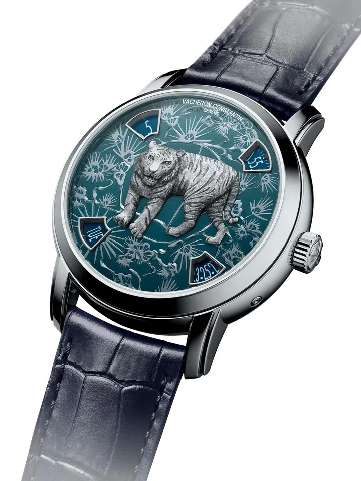 宝玑(Breguet)的Classique系列7145猛虎精雕腕表,表盘图案采透视效果并分浅浮雕、黑色加工、机刻雕花三阶段工艺修饰,具象出老虎的形体轮廓、同时赋予深邃对比,更加上机刻雕花工艺的修饰增色。老虎的眼神宛如直视前方,而虎皮与背景的纹路则宛如马赛克拼接般,又带有装饰艺术意味。自动上炼的502.3超薄机芯具备矽质擒纵叉和摆轮游丝,共由162个零件组成,全球限量8只。