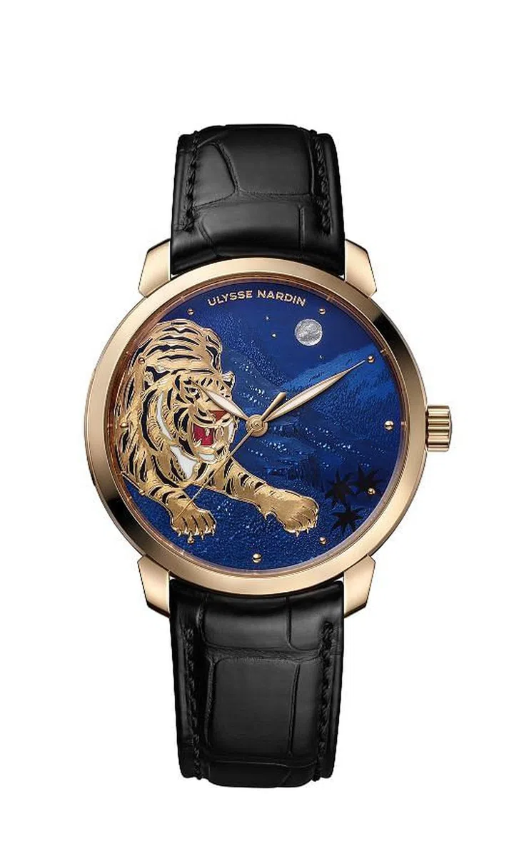 雅典表(Ulysse Nardin)以金雕技法描绘了下山虎于松枝明月间威声长啸的壮阔场景,悬于空中的一轮明月、点点星光与地上的山丘棱线岩石质感都十分逼真,契合著传统文化中下山虎学成归来、财运亨通的美好意象。 艺术大师透过一次次珐瑯彩绘和烧制,在方寸表盘间捕捉瑞虎的自然精神与形态,仔细欣赏瑞虎身上细致的虎斑纹路,点缀著具有王者之姿的白色鬃毛,亮眼且具有不同颜色层次的红色珐瑯则在瑞虎口中与鼻头点亮精神,为整体图案赋予生命。