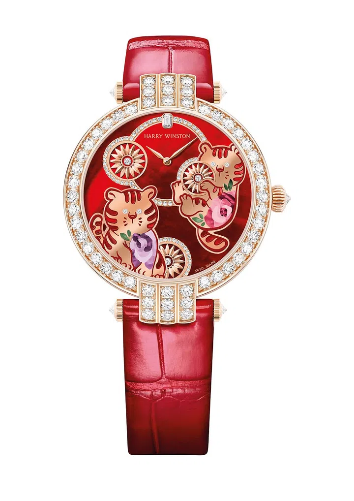 在脱离母虎的守护之前,老虎的幼崽会通过与兄弟姐妹嬉闹玩耍来增强自己的捕猎技巧和认知外面的世界。海瑞温斯顿(Harry Winston)推出的卓时Premier系列农历新年主题腕表,以一对幼年福虎为主角,象征着力量与胜利,同时也有着祈福、辟邪、生生不息的寓意。为了诠释虎崽黄褐色皮毛的流线感,每一只幼虎都以玫瑰18K金手工打造而成,而猫科动物特有的标志性条纹则以线条勾勒出来并以微珠打磨的红色珍珠母贝填充。可爱的脸庞、小巧的鼻子和发散的胡须都被一一勾勒出来,映衬钻石镶嵌的炯炯有神的双眼。红色珍珠母贝表盘和玫瑰金的完美结合,呈现出这款充满欢庆气息的农历新年腕表,象征着一年年的好运与繁荣。