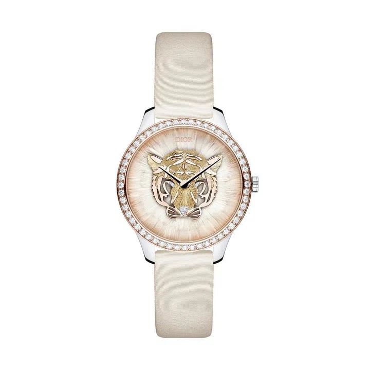 特制的迪奥(Dior)Grand Soir Tigre虎年生肖限量腕表,在表盘上安置了一个表层经镀金处理与雷射切割出羽毛纹路的虎头图像,并以1颗三角型切割美钻妆点鼻子、2颗马眼型切割美钻点亮老虎的眼神,同时呼应着迪奥时装与羽毛紧密的装饰关系,在制表时特意于表盘上铺垫了3层总数达98支的纤细羽毛作为虎头出场的背景,令老虎形象不过于阳刚威猛,还多了点时尚气息。限量编号发行88枚。