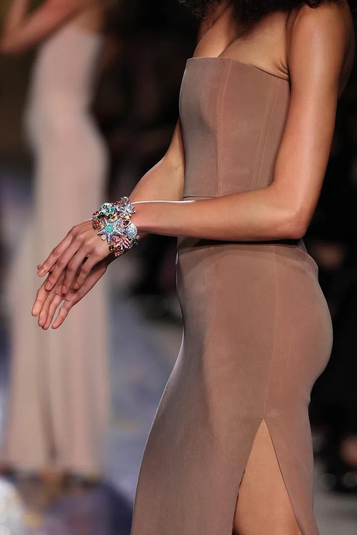 模特们恣意展示宝格丽Mediterranea高级珠宝系列作品的璀璨华美。为了此次珠宝秀,高级鞋履品牌Rene Caovilla还对经典CLEO凉鞋进行了焕新演绎,采用饰以灵蛇图案的踝带设计,而灵蛇正是宝格丽无比珍视的动物图腾,且今年也正值品牌经典Serpenti系列诞生75周年。