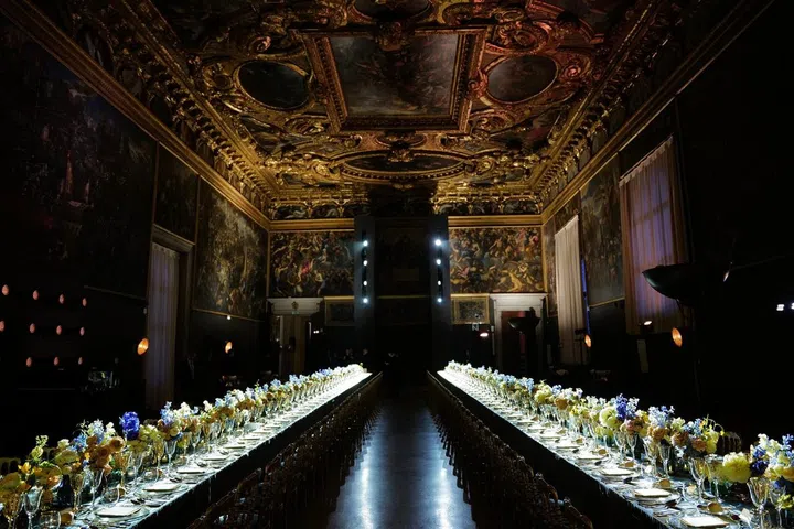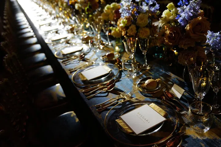 珠宝秀结束后,宝格丽在总督宫的审议大厅举办了一场庆祝晚宴,晚宴桌上装饰着由Rubelli为此次活动专门制作的纺织品。此外,米其林星级厨师马西米利亚诺·阿拉伊莫还为宾客们精心准备了一份特别设计的菜单。马西米利亚诺·阿拉伊莫出生于意大利威尼托,他是著名餐厅Le Calandre的掌舵者,该餐厅于2017年荣获米其林三星称号。