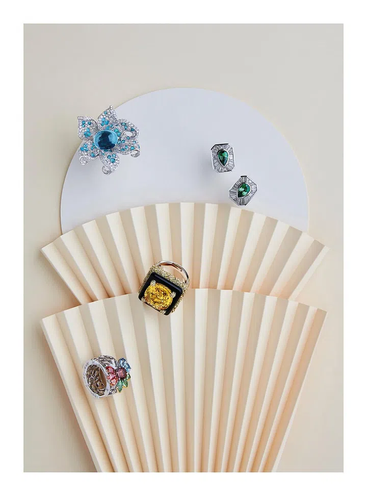 上至下: 18K白金镶嵌海蓝宝石、帕拉伊巴碧玺和钻石戒指;18K白金镶嵌沙弗莱石和钻石耳环; 18K黄金镶嵌黄色蓝宝石和缟玛瑙戒指;18K白金镶嵌沙弗莱石、海蓝宝石、钻石和粉红色碧玺戒指/Flower Diamond。