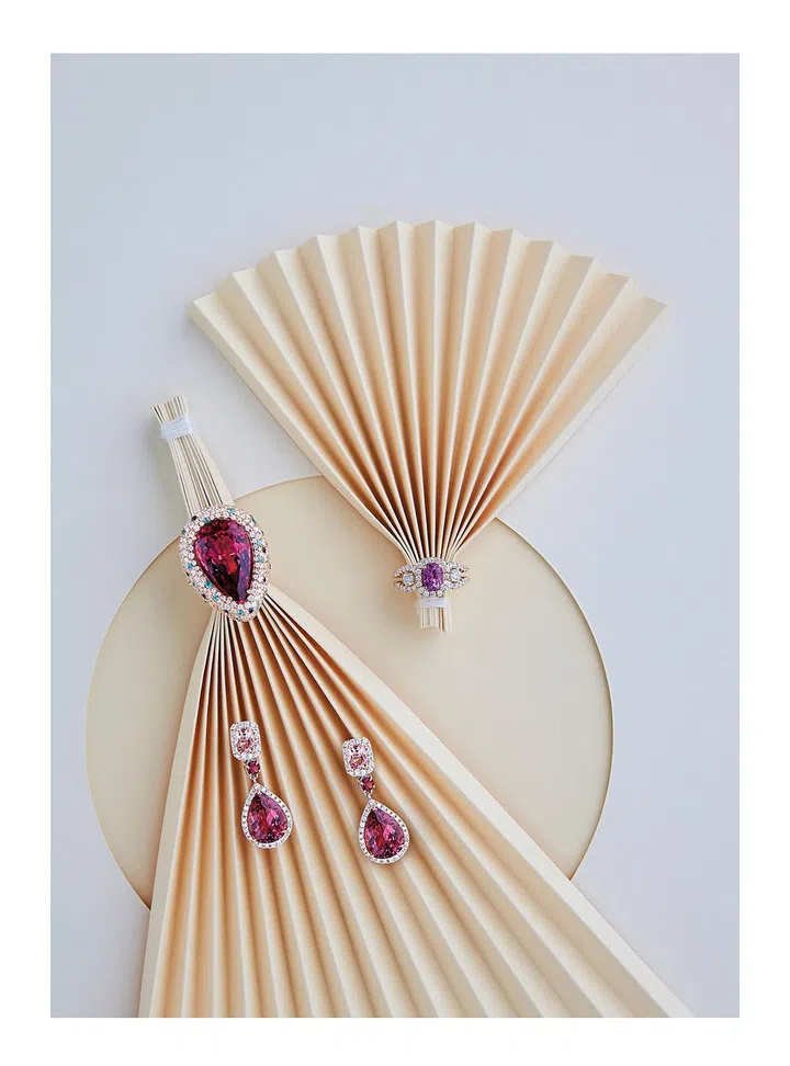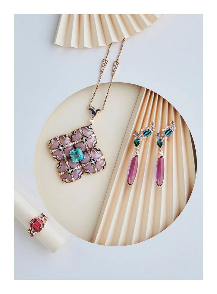 上至下: 梨形粉紅色碧玺、帕拉伊巴碧玺、蓝宝石和白钻戒指; 粉红色蓝宝石与钻石戒指; 粉紅色碧玺、枕形切割摩根石和圆形卢比来耳环/Yuli Inc. Fine Jewellery。
