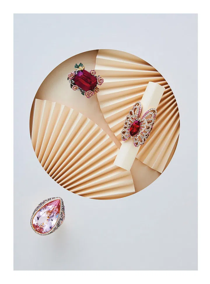 左至右: 18K玫瑰金镶嵌摩根石、钻石、粉红色蓝宝石和蓝宝石戒指; 18K白金、玫瑰金和黄金镶嵌红碧玺、黄色蓝宝石、钻石、沙弗莱石和粉红色蓝宝石戒指; 18K玫瑰金镶嵌碧玺、白钻、粉红色蓝宝石、褐色钻石戒指/MUS.za。