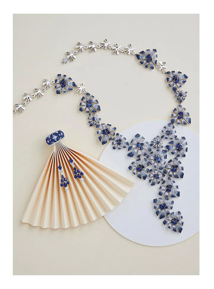 上至下: Mio Prezioso白金镶嵌钻石和蓝宝石项链; Eloise白金镶嵌钻石和蓝宝石戒指; Kaisley白金镶嵌蓝宝石和钻石耳环/Lee Hwa Jewellery。