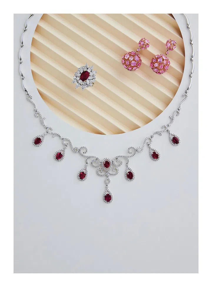 上至下: One of a Kind系列Pink Globe耳环,18K玫瑰金镶嵌粉红色蓝宝石; One of a Kind系列18K白金镶嵌椭圆形红宝石和钻石戒指; One of a Kind系列Your Majesty红宝石项链,18K白金镶嵌红宝石和圆形明亮式切割钻石/Poh Heng Jewellery。