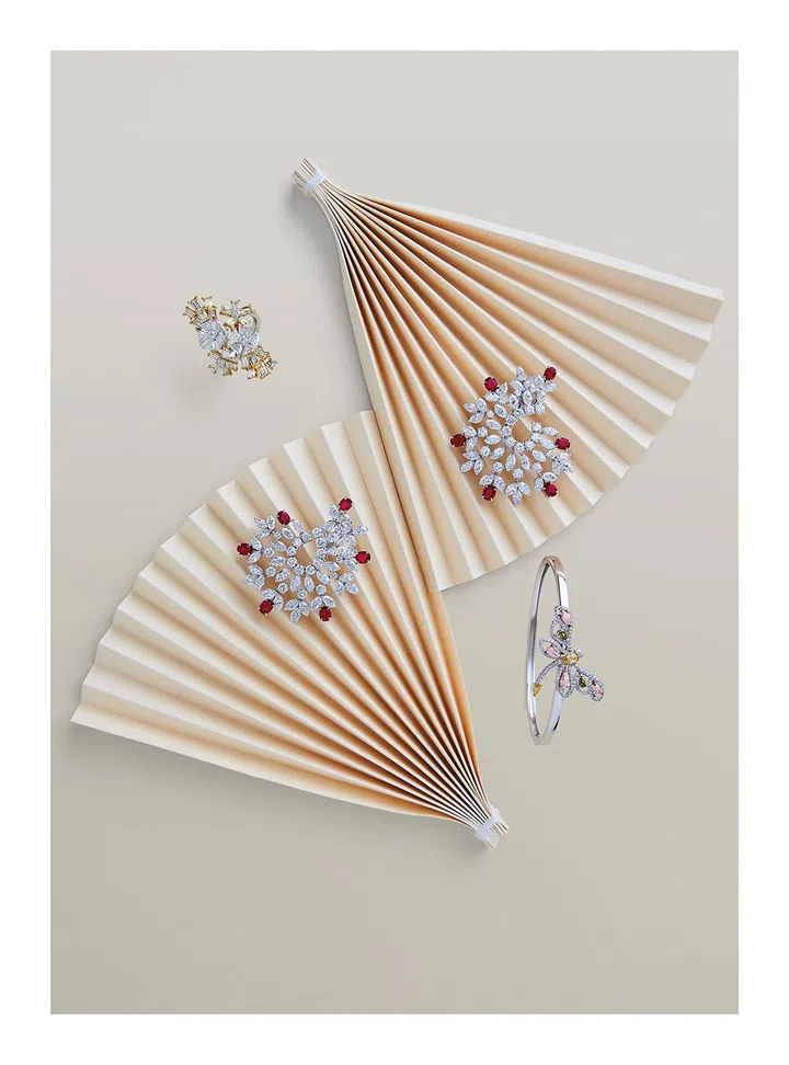 上至下: Sunrise系列戒指,18K黄金和白金镶嵌黄钻和白钻; Bridal系列红宝石和钻石耳环; 18K白金镶嵌橙色、粉色、绿色、黄色和白色钻石手镯/Vihari Jewels。