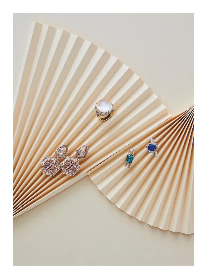 左至右: Jazz Age Icon可转换式耳环,18K玫瑰金镶嵌六角形摩根石、风筝型切割钻石、粉红色钻石和钻石; Moonlight Reverie戒指,18K玫瑰金镶嵌月光石和圆钻; Rhapsody戒指,18K玫瑰金镶嵌祖母绿形切割碧玺和圆钻; Midnight Gleam蓝宝石戒指,18K白金和黄金镶嵌钻石和枕形切割蓝宝石/B.P. de Silva。