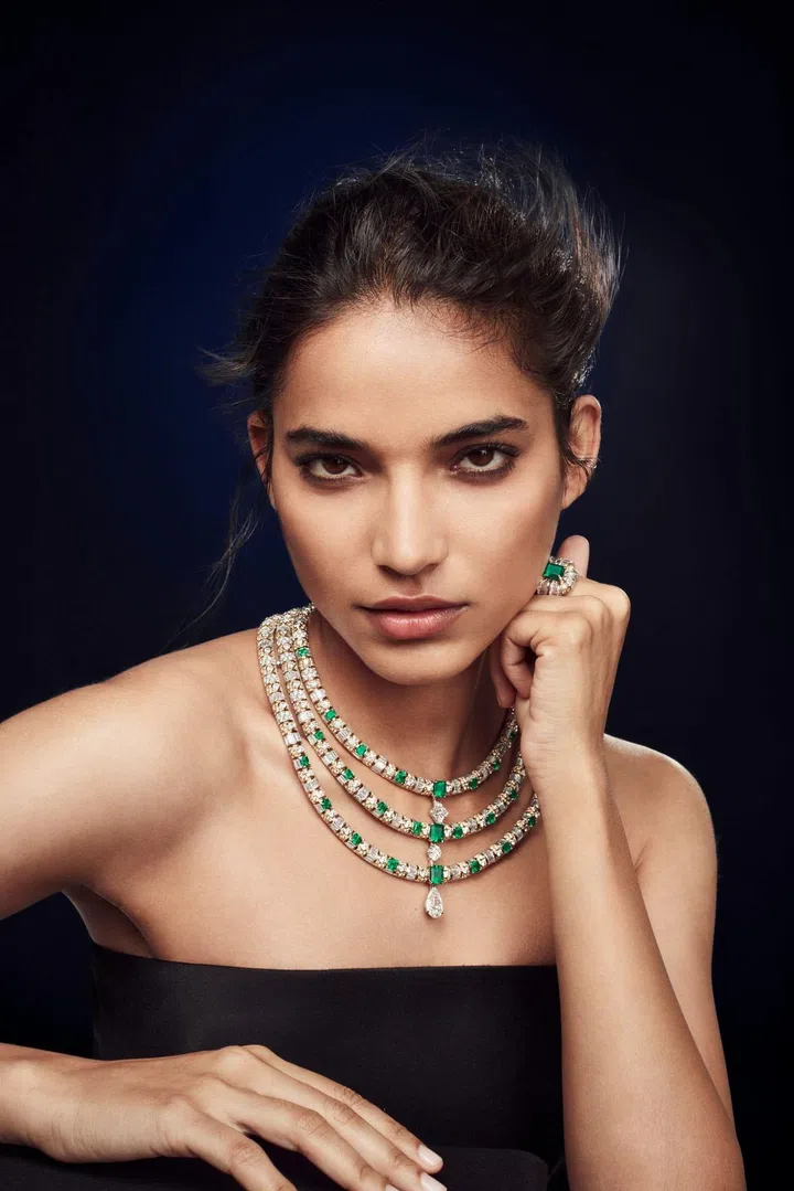 这套奢华的高级珠宝重现了路易·威登先生年少时穿越汝拉山区,一路途经400公里的道路和森林,最终抵达巴黎的旅程。项链中的绿色来自耗时两年研究、配对的精美哥伦比亚祖母绿宝石,与三排铂金、黄金和白金密镶钻石结合。每一条项链都以Damier棋盘格式宝石镶嵌,呈现四种不同的钻石排布方法,是一件充满光泽的艺术品,在LV Monogram花型切割钻石和一颗色泽饱满,纯净无暇的5.21克拉DFL 级2A型梨形钻石的点睛下熠熠生辉。此款项链经过长达1600小时的匠心打磨,可以六种方式随心佩戴。该系列另外包含三枚戒指、一条精美手链和两对耳环—— 分别饰有珍稀宝石,包括哥伦比亚祖母绿宝石和两颗均为3.19克拉的DFL级2A型梨形钻石。