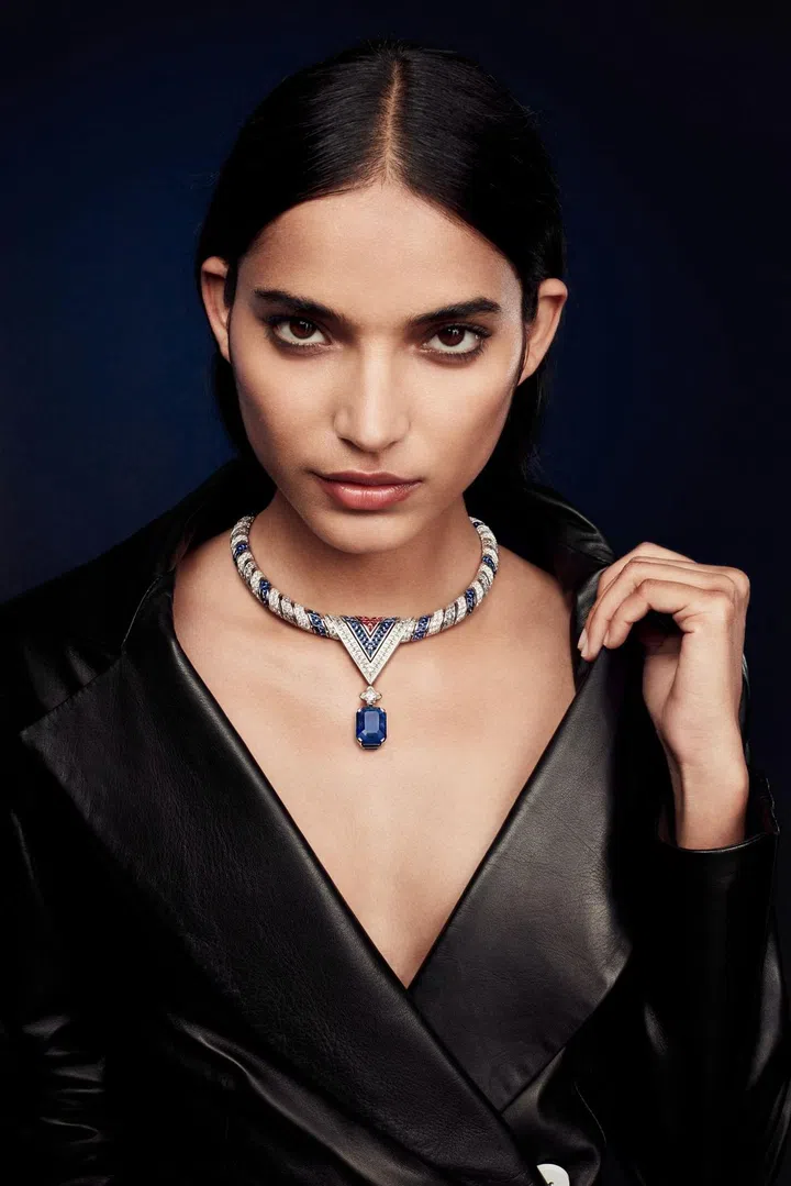 The Arrow的造型既是对路易·威登探险之旅的隐喻,亦是他名字中字母V的巧妙演绎,通过精湛钻石镶嵌工艺和珍稀宝石予以升华。项链正中央镶嵌着由红宝石、蓝宝石和钻石构成的三色V形造型,正是对路易威登创始人孙辈Gaston-Louis Vuitton个人标识的崇高赞美。它仿佛一条奢华围巾萦绕于颈间,其顶端缀有一颗2.61克拉DIF级2A型LV Monogram花朵型切割钻石和一颗重量超过26克拉的斯里兰卡皇家蓝蓝宝石。此款项链形态优雅,采用精湛对角线密镶工艺,可以三种方式随心佩戴。它激发了整套奢华珠宝的创作灵感,包括一颗极其罕见的重达18.62克拉的天鹅绒蓝蓝宝石。