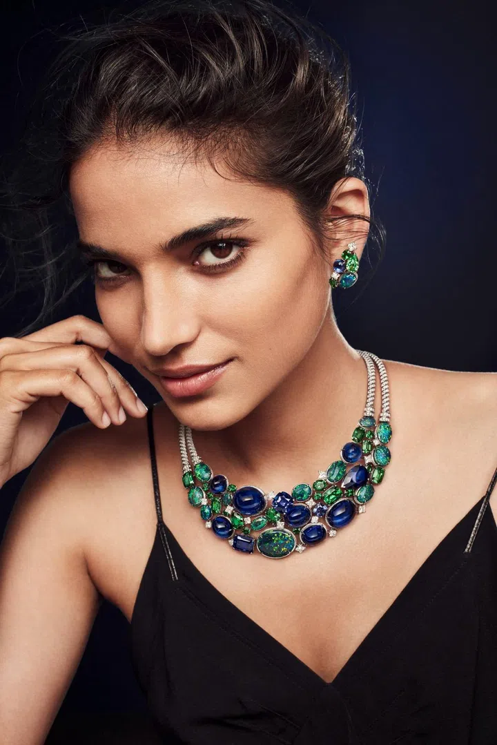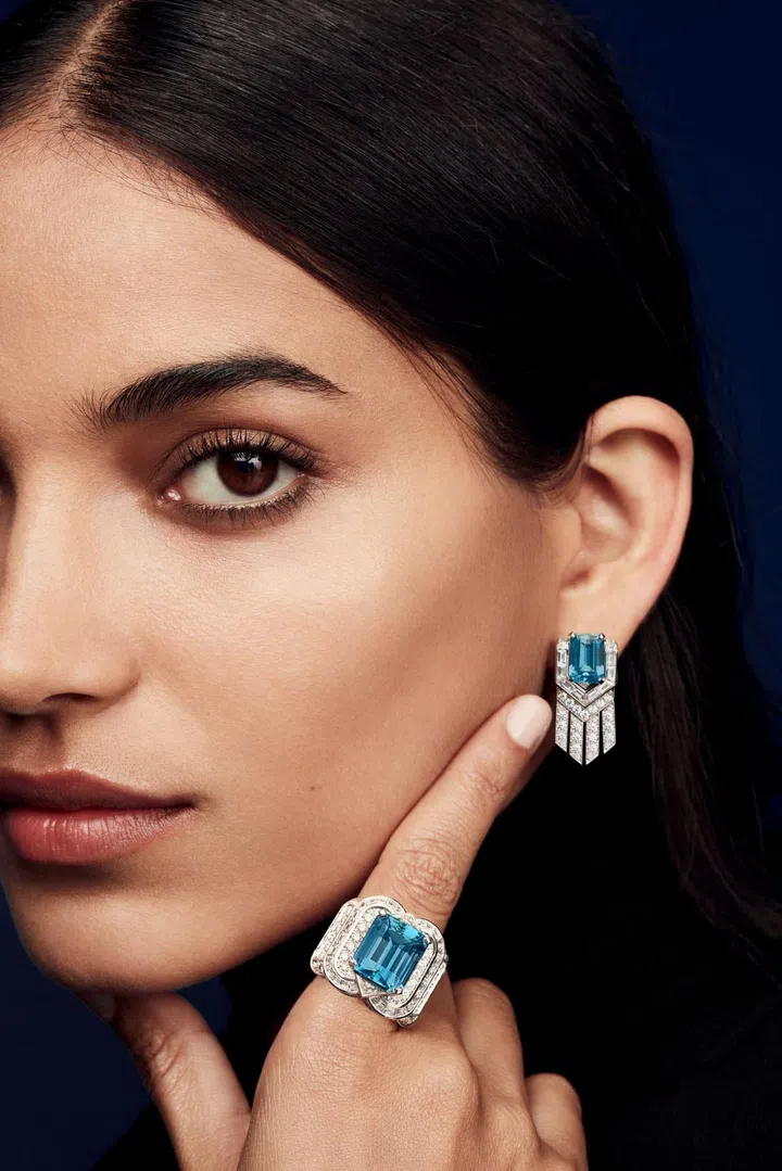 该系列的每一件作品都运用了极为珍稀的宝石,其重要性与精彩设计并驾齐驱。路易威登团队耗时整整三年,在全球范围内搜寻蓝宝石、祖母绿、红宝石、优质钻石以及各类宝石,最终呈现出无与伦比的丰沛色泽。团队对珠宝工艺无可比肩的知识与技艺使得这些宝石得以升华,切工与镶嵌皆出自严密的量身定制,比如直接在作品上进行切割的 1700 颗宝石。110 颗Monogram-cut 钻石火彩熠熠生辉,相映成趣,作为路易威登的标志性钻石,仿佛LV Monogram 花朵图案的闪亮化身。