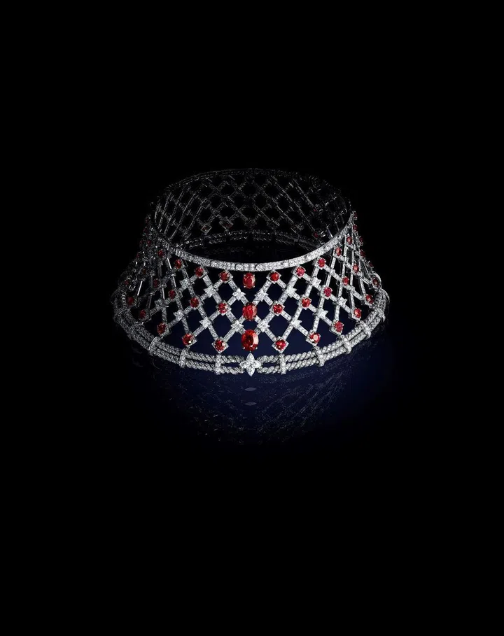 作为Francesca Amfitheatrof的标志性作品之一,此款菱格项链灵感源自路易威登旅行箱内部的菱格纹内衬。镶嵌着钻石和 75颗珍稀圆形红宝石的白金项圈巧妙衔接,佩戴于脖颈,宛若第二层肌肤。三颗分别重达5.03、3.52和2.24克拉的明艳莫桑比克红宝石令这款项链散发火红光芒,末端缀有一颗镶嵌在双钻绳上的3.29克拉LV Monogram星形切割钻石。以同样设计灵感出发,还为本系列打造了一款袖口式手镯、两枚戒指和夹式耳环。