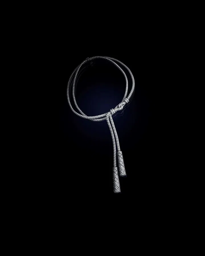Francesca Amfitheatrof为重现年幼的路易离开汝拉山区远赴巴黎的魄力,从无限螺旋的DNA 链汲取灵感,设计出炫目图案。白金和钻石镶嵌的吊坠绳也象征着年轻的路易用于打包旅行箱的绳索。这条蔚为壮观的项链由2000颗光彩夺目的钻石镶嵌而成,其间点缀数颗 Monogram 星形切割钻石,使得项链在柔软灵动的同时兼具分量与细腻气息。项链如瀑布一般倾泻而下,随身体的自如动态摇曳生姿。系列中手镯、耳环、短项链和戒指皆与这条单色项链交相辉映。