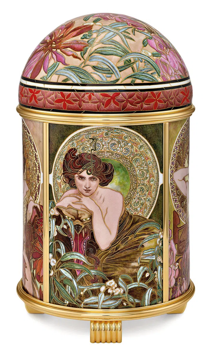 Ref. 20157M-001“缪斯”圆顶座钟采用掐丝珐琅工艺,并饰有微绘珐琅,再现了著名捷克画家阿尔丰斯·慕夏(Alfons Mucha,1860-1939)作品中风格化的植物形态和柔美曲线的魅力。Ref. 10037M-001小型圆顶座钟致敬了古斯塔夫·克林姆(Gustav Klimt)的画作“生命之树”,Ref. 20158M-001 圆顶座钟则从克劳德·莫奈(Claude Monet)的“白睡莲池塘”采撷灵感。 百达翡丽设计师和工匠以丰富想象和精湛技艺演绎这些灵感。此外,三款掐丝珐琅小型圆顶座钟饰以令人耳目一新的几何形状钟表部件。