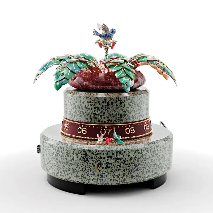 梵克雅宝(Van Cleef & Arpels)以创作“诗意复杂功能”闻名,每年推出的自动机械装置座钟,都会成为整个“钟表与奇迹”表展的最大视觉焦点之一。此次呈献的Apparition des Baies“绿野秘境”自动机械装置,呈现玫瑰金叶片开合的过程。当叶片徐徐绽放后,玫瑰花苞吐蕊,隐藏其中的用白K金制成的小鸟儿振翅欲飞,栩栩如生。这只小鸟周身镶嵌满钻石和蓝宝石。梵克雅宝工坊特别为这件臻品研发一套全新的旋转系统,操控绿穹的开合,与François Junod设计的机械装置相配得宜。装置由112块交叠的叶片组成,层次丰富而细腻。此外,这台机械装置的底部由两块达尔马提亚碧玉,以及一个由稀有粉红色锰黝帘石制成的石盆组成。这些石材由梵克雅宝的宝石学专家挑选后,再由工匠细心切割和抛光。