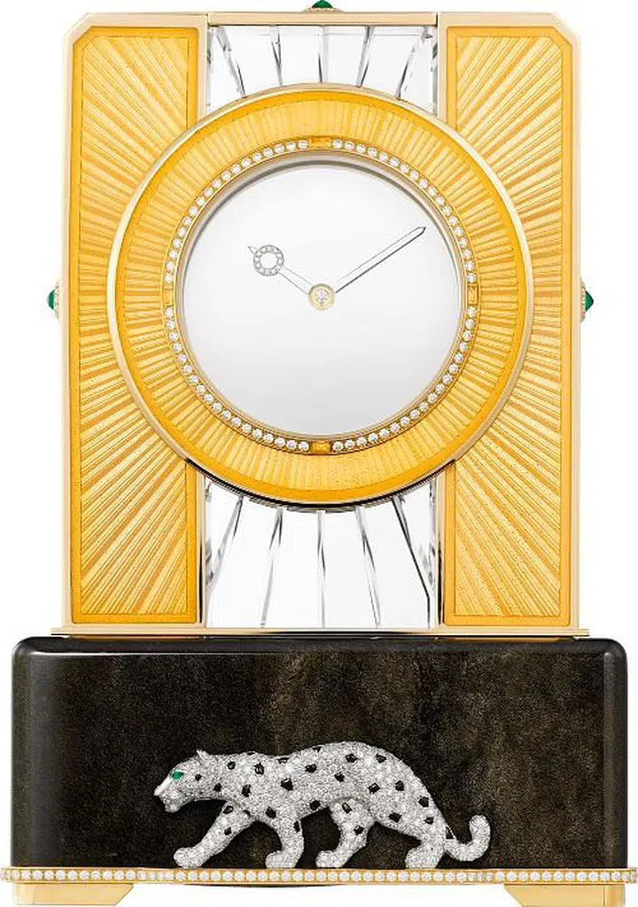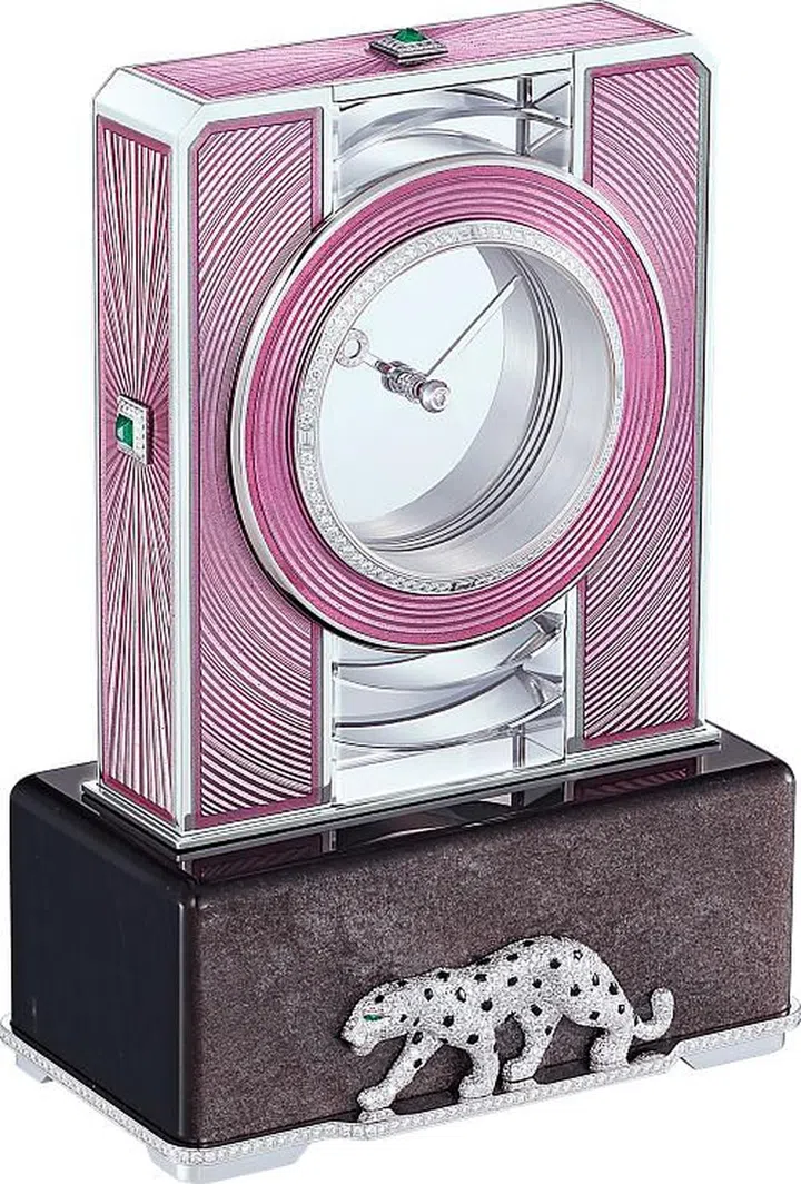 粉色和蓝色珐琅款的镶钻表圈外以同心圆环绕装饰;而黄色珐琅款的表圈四周则以太阳纹放射图案装饰。镶钻表圈的12时、3时、6时和9时位置设黄色蓝宝石或长方形切割钻石时标。在透明表盘两侧,饰有以金和珐琅点缀的凹槽图案。它与白水晶相映成辉,演绎深邃质感。座钟整体固定于黑曜石底座上,其色调随款式不同而有所变化。这正是卡地亚描绘猎豹生动姿态的舞台。钻石皮毛、缟玛瑙豹斑和祖母绿豹眼皆以立体浮雕手法呈现,猎豹仿佛在崭新、神秘而亲密的时光中优雅前行。