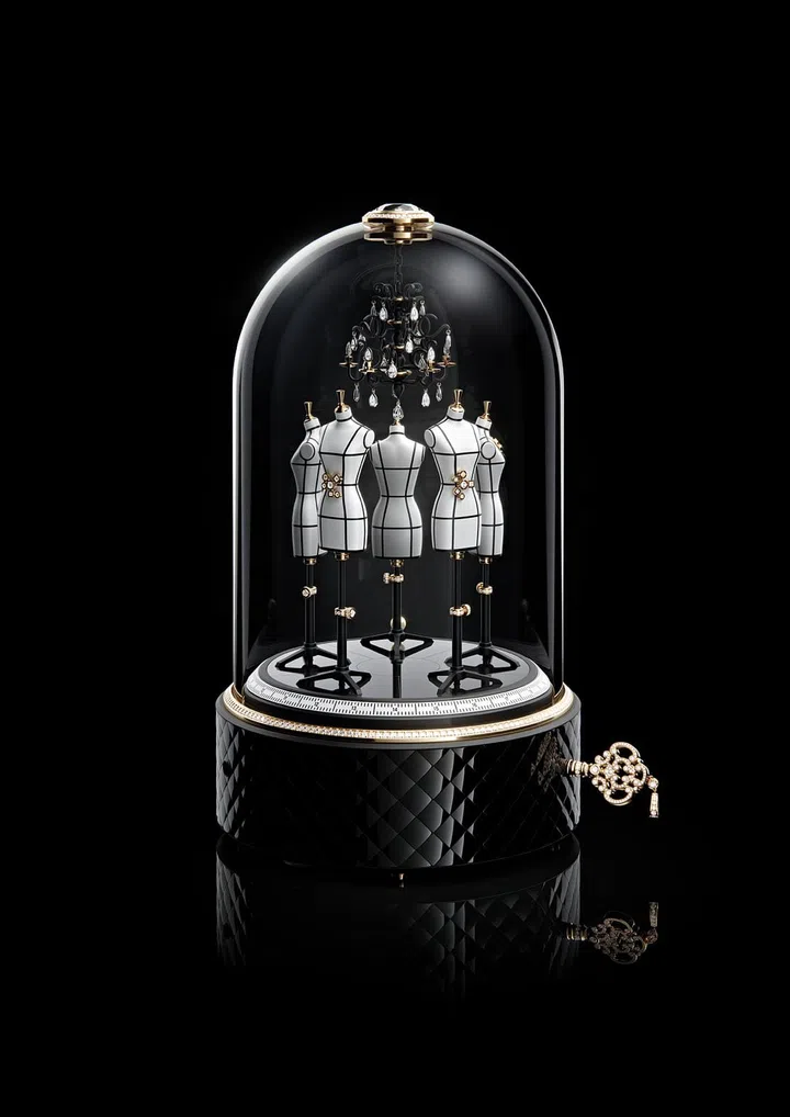 不仅如此,在玻璃穹顶的顶部嵌有钻石点缀的微型吊灯,而用⻩K金装饰的座钟底座则以香奈儿标志性的菱格纹软垫沙发为灵感所设计,呼应了嘉柏丽尔·香奈儿的寓所。这台座钟的读时位置位于半身人台摆放的台面外侧,以黑白色围绕一圈,与时装设计常用的卷尺造型形似。值得注意的是,这台座钟需要手动上链。香奈儿为此设计了一条黄K金镶钻长项链作为专用上链钥匙。这件由众多技艺高超的制表大师精心打造的非凡作品既是座钟,亦是八音盒、活动人偶装置。