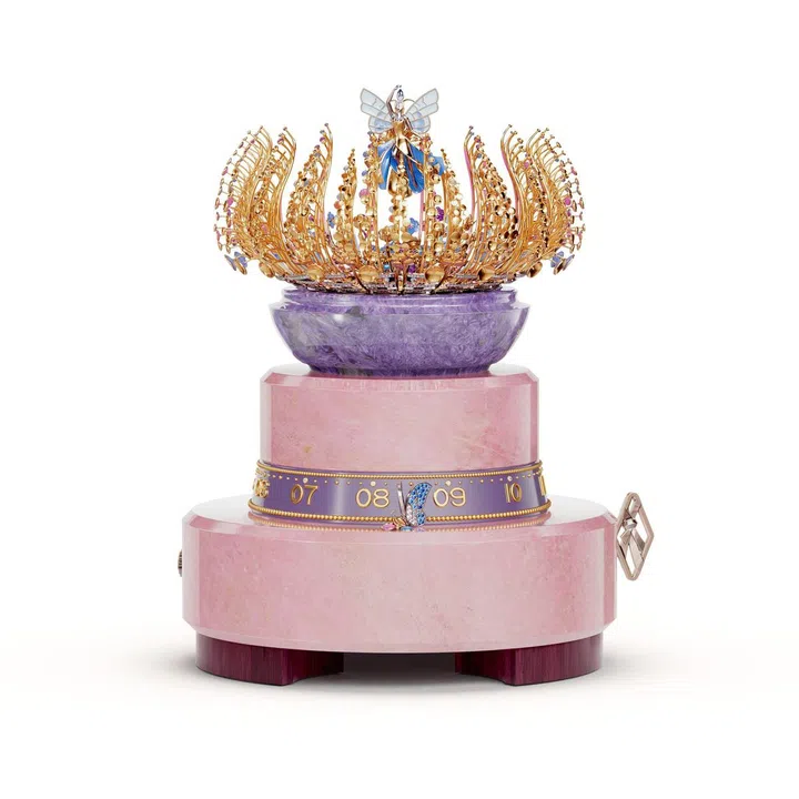 这台自动机械装置呈现的是当花苞盛放后,头戴钻石冠冕、身穿蓝彩玫瑰金羽衣的仙子在花田上起舞的景象。仙子的脸庞镶嵌有玫瑰形切割钻石,挥动着plique-a-jour彩绘珐琅翅膀,伴随足尖踏出的曼妙舞步,与指间的水滴形切割钻石碰撞出轻快的节拍。装置的弧形金质箔片需要用手工组装,并经过多番抛光打磨,以制造出金属自有的光芒。共684枚箔片采用喷枪及传统技法上漆,以增强每种颜色的鲜明色彩,最后手动组合完成。底座采用了粉红色锰黝帘石,以及查罗石,色彩与光泽相得益彰。