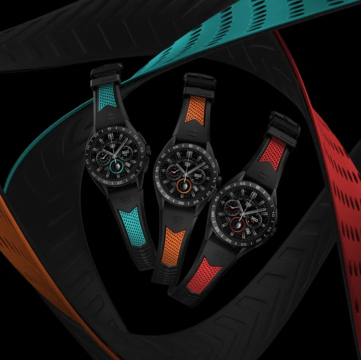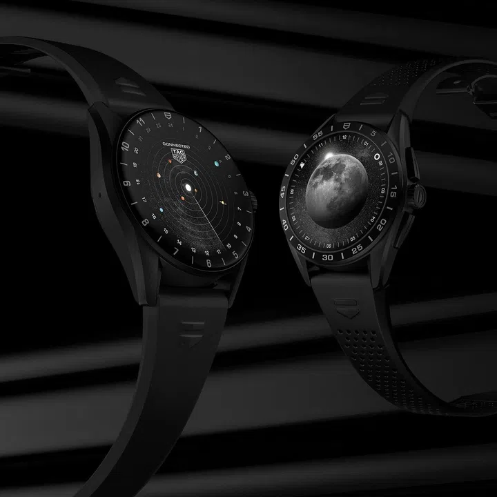 TAG Heuer Connected Calibre E4智能腕表“42毫米黑钛版”,采用雾面黑色喷砂DLC2级钛金属材质,全黑美学兼具都会、运动和优雅气息。光滑快拆式黑色橡胶表带和黑色钛金属折叠表扣,128英寸的OLED大萤幕以弧形蓝宝石水晶表镜保护,表底盖采用黑色DLC2级钛金属制成,其中央装有心率感测器。