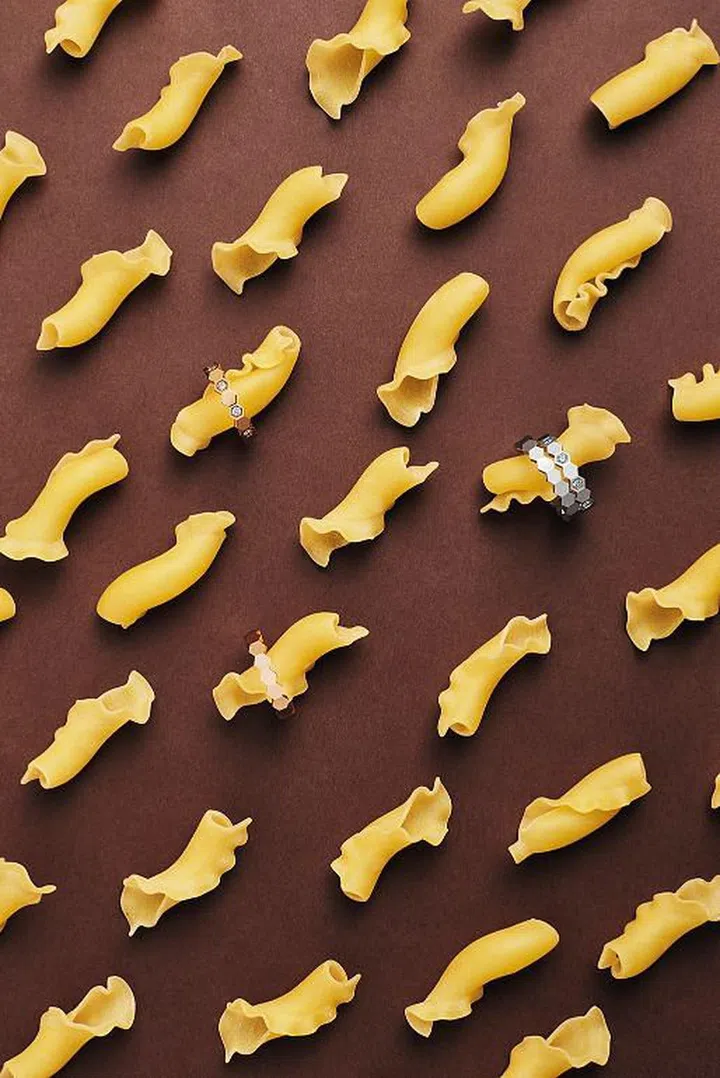 Bee My Love系列玫瑰金戒指,间隔铺镶钻石; Bee My Love系列白金戒指,间隔铺镶钻石; Bee My Love系列白金戒指,内嵌一颗钻石; Bee My Love系列玫瑰金戒指,内嵌一颗钻石/Chaumet。