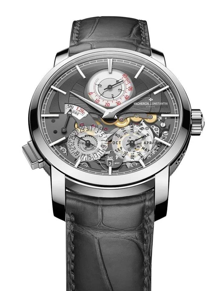 双重芯率万年历是今年江诗丹顿,乃至整个表展上最重量级的手表。原因在于江诗丹顿双重芯率万年历对传统的万年历进行了一次重大革新。江诗丹顿双重芯率万年历一只手表上,有两个走时轮系,一个摆频高,一个摆频低,高低两个频率,可以随时切换,高频摆频36000次/时,低频摆频8640次/时。正常佩戴时,切换到高频上,不戴时切换到低频上,在低频上手表动力消耗大幅下降,动力储存时间长达惊人的65天(高频动力4天)。